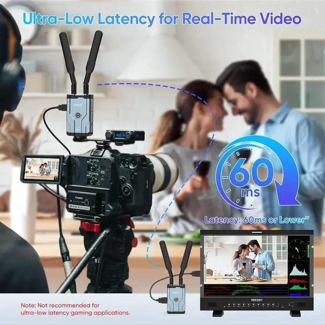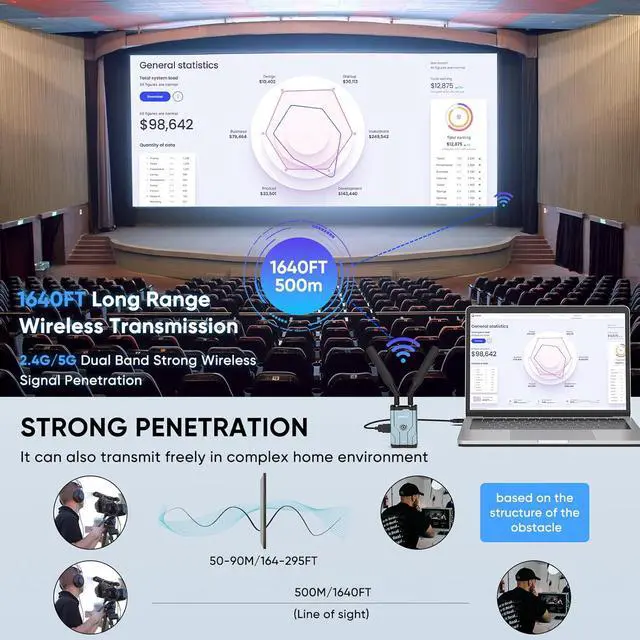 Up to 500m Stable Transmission RangeWireless hdmi transmitter and receiver adopts dual antenna design,2.4/ 5.8G high-speed transmission and strong signal. By using WiFi transmission technology and through the point-to-point connection between transmitter and receiver equipment, extends 1080P full HD HDMI signal wirelessly up to 1640ft in an open field without interference. Note: Walls, bricks or glass can shorten signal coverage or cause severe signal loss for the wireless hdmi transmitter and receiver kit