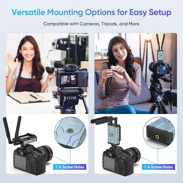 Special Designed for CameraWireless hdmi transmitter and reciever is designed for camera based on is 1/4 screw hole on the top and bottom of hdmi transmitter and receiver, it makes sure seamless connection with the camera, backside of wireless transmitter and receiver support np battery which makes it more easy for long time use,and wireless hdmi transmitter and receiver can be powered by multiple ways including power bank, NP-F series batteries(Note: NP-F batteries are not included), or via USB-C ports.