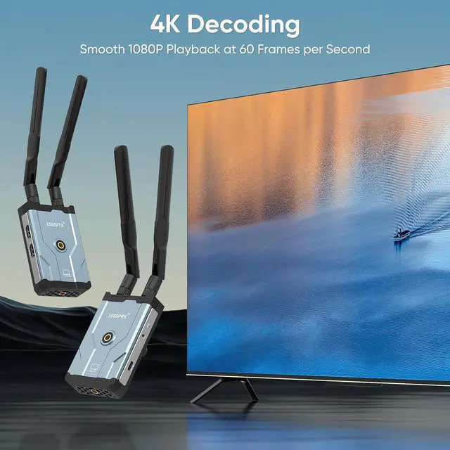 4K Decoding, 1080p Wireless TransmissionWireless HDMI Transmitter and Receiver Input/output resolution supports 4K decoding and up to Full HD 1080p @60Hz, the image is clear and stable very smooth, colorful and high sound quality without noise. Note:0.1s latency for real-time games and sports programs