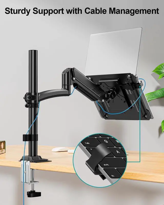 Space Saving - Our laptop stand for desk frees up valuable space and creates a clean work environment. The laptop arm has internal cable management pass-through features to organize wires and cables. Just enjoy your working, gaming or viewing hours in a more comfortable environment.