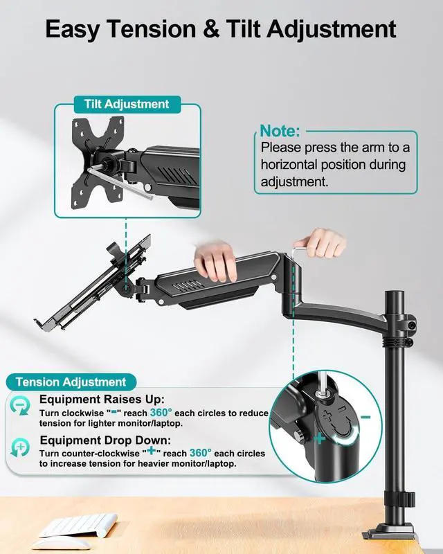 Full Motion Adjustable Laptop Mount - The laptop arm mount offers -45° to +90° tilt, 180°swivel, 360° rotation. With this laptop mount, you can achieve the perfect ergonomic posture and elevate your productivity. Note: 360° rotation is recommended only for monitor instalaation. When you're using the laptop tray, please do not to rotate the tray to a vertical position to ensure safety.