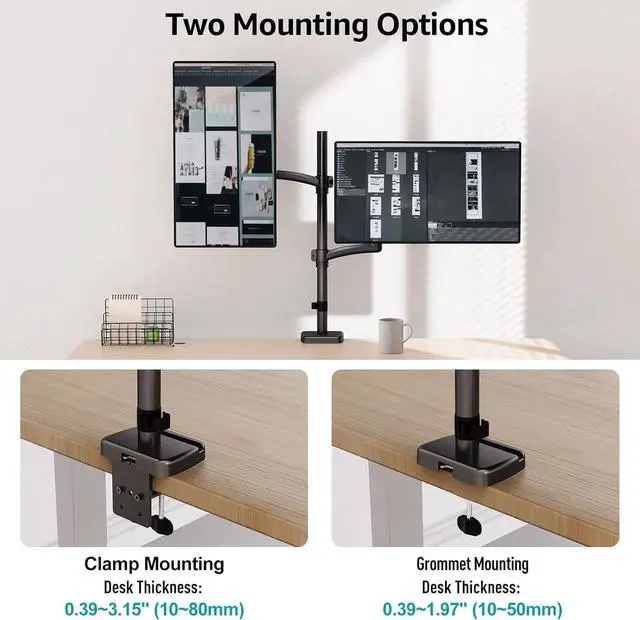 Easy Installation - We provide labeled parts and clear instructions for quick assembly. Support for C-clamp and grommet mounting options. C clamps fit desk thicknesses up to 0.39" - 3.15" while grommet mounting works well with desk thicknesses up to 0.39" - 1.97". Meet your needs with different desks, stable and not easy to shake.