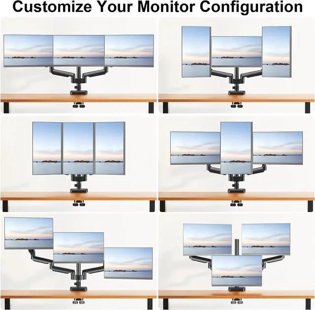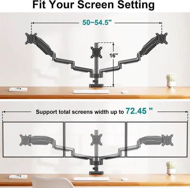 Full Motion Monitor Desk Mount - This triple monitor arm enables you to adjust the monitor with 360° rotation, ±90° swivel, and -90°/+90° tilt functions, easily finding optimal view angle. This three monitor arm is free to hovers (adjustable height: 11.4") by adjusting the monitor arm to proper tension.