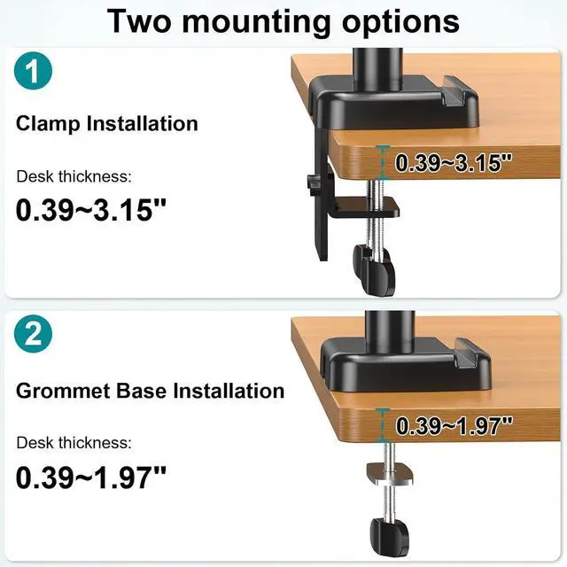 Dual Install Options - Fits desks with or without a hole. C-Clamp is mounted on the desk from 0.39" to 3.15" in thickness and grommet base mounting works for desks with thickness up to 1.97". If your monitor is heavy or your desktop is thin, we recommend you purchase a reinforcement plate (ASIN:B0B7BS4TBX) to spread out the pressure of the mount over a large area, preventing your desks from damage.