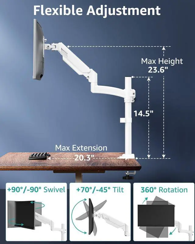 Raise Your View - The computer monitor stand features a 14.5 inch central pole that elevates the screen to a higher position. This single tall monitor arm can achieve a 30% increase in height, allowing the monitor to reach a maximum height of 23.6 inch. In addition, and maximum extension is up to 20.3 inch. All the design is ideal for ergonomic viewing, can adjust the monitor according to your physical condition and workflow. For higher or longer mount, please search B0DN5SM8L1.