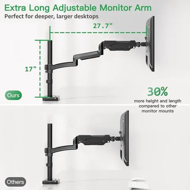 Extra Long Monitor Arm: Our monitor arm desk mount features extended arms that extend up to 27.76", perfect for deeper, larger desktops. With this single arm monitor mount, it can save more than 80% desktop space, you can place setup such as keyboard, mouse and laptop freely. Integrated cable management on the tall monitor arm allows you to route cables neatly for a cleaner, more organised look. Now your workspace is clutter-free!