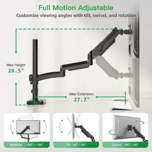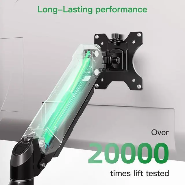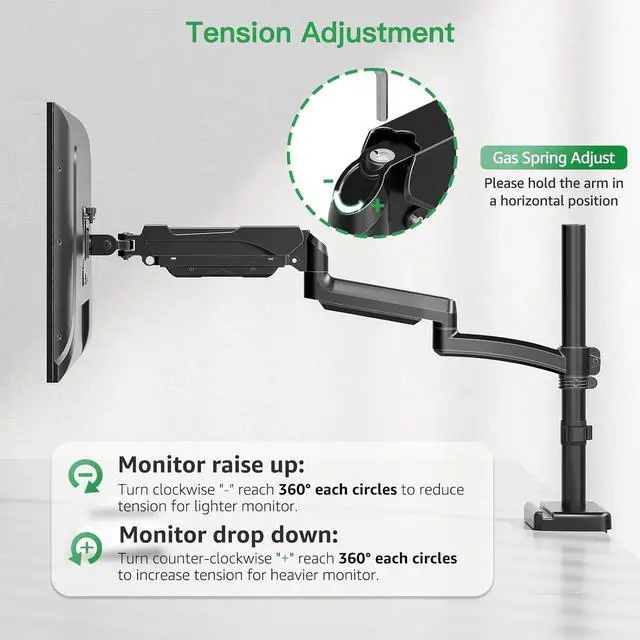 Robust and Durable Construction: The monior arm of this pc monitor mount has been tested to withstand 20,000 motion cycles, ensuring long-lasting performance. The robust construction provides superior stability even during movement or adjustments. Comes with clearly labeled parts and clear instructions, you can choose clamp mounting (suitable for desks from 0.39 to 3.15" thick) or grommet mounting (suitable for desks from 0.39 to 1.97" thick).