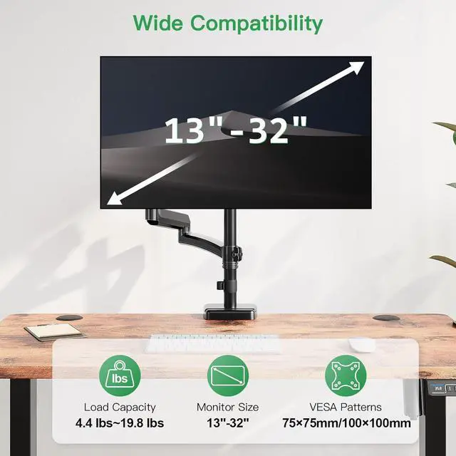 Suitable for Your Monitors: Our single monitor arm perfectly fits most flat or curved LCD/LED screens from 13" to 32", holding 4.4-19.8 lbs, suitable for VESA 75x75mm & 100x100mm patterns. Compatible with ASUS, Acer, Samsung, LG, AOC, Dell, etc. not limited to 32 30 28 27 25 24 23 22 21 20 19 17 inch screen, but not compatible with 1000R/1500R/1800R curved screens.