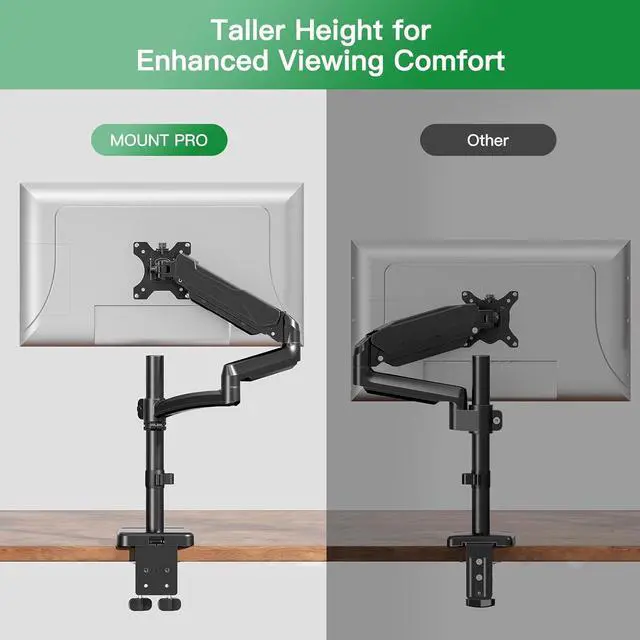 Elevate Your View Experience: Our single monitor stand boasts a taller pole, providing 30% greater height and a broader viewing range compared to other vesa monitor mount. It can position your monitor up to 28.5 inches above the desktop, aligning it closer to eye level for enhanced ergonomic comfort and reduced discomfort. Additionally, the extended column design is particularly beneficial for individuals of taller stature, offering them more versatile height adjustment options to achieve optimal eye-level viewing.