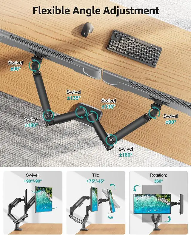 Free Up Your Desk Space - Upgrade your monitor to free up valuable desktop space, creating a clean, professional, and efficient workstation. The dual arm monitor mount releases more than 80% desktop space compared to a monitor holder with large base. You can place office accessories freely. Built-in cable management keeps cords neatly organized for a clutter-free setup