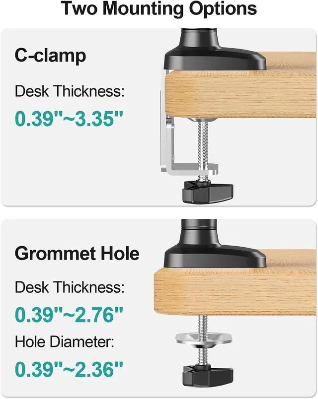 Effortless Installation - Equipped with clear manual and mounting hardware needed. You can choose drill-free c-clamp mounting (suitable for desks from 0.39 to 3.35" thick) or grommet mounting (suitable for desks from 0.39 to 2.76" thick)
