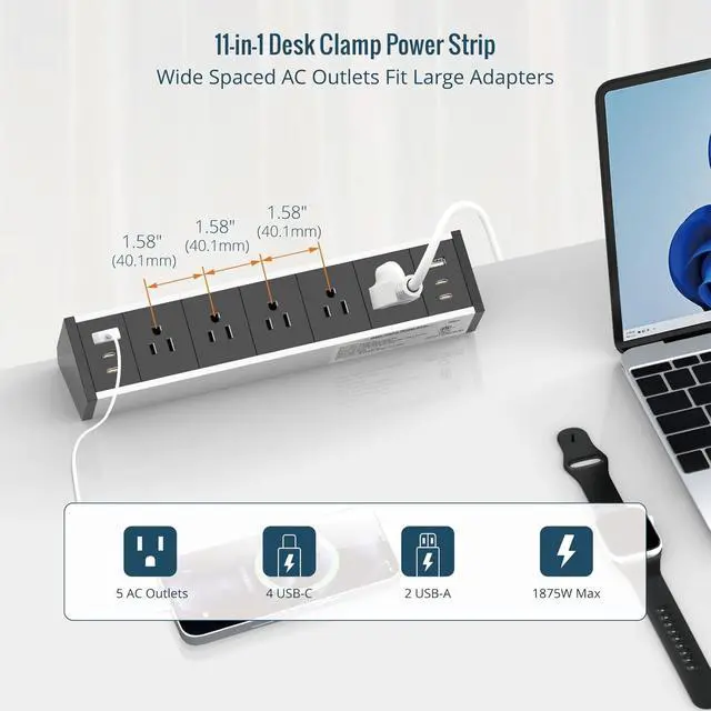 Wide Spaced AC Outlets: Five outlets designed to fit large adapters without blocking others, ensuring versatility for all power needs