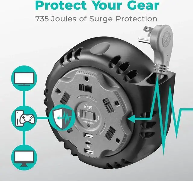 CONVENIENT: This self-contained and portable surge protector has a 8-foot 14/3 retractable extension cord that manually winds into an internal cord reel. The durable PVC cord has a low-profile plug to easily fit behind furniture.