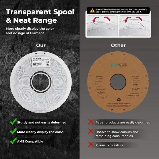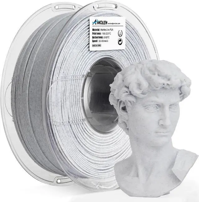Enjoy a hassle-free printing experience with AMOLEN pla marble filament 1.75 mm that is orderly wrapped, melts well, and feeds smoothly and constantly without clogging the nozzle or extruder.
