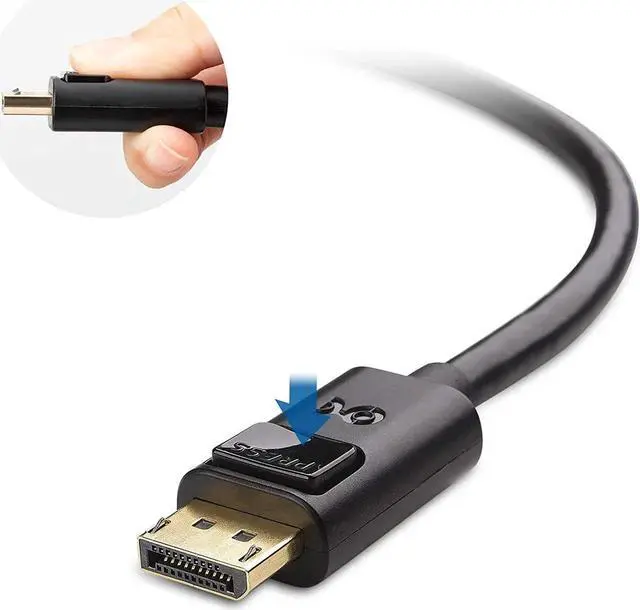 DVI to DisplayPort connector with latches provides a secure connection with a release button that must be depressed before unplugging