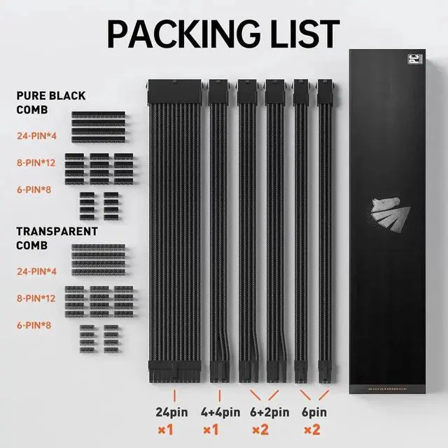 Cable Management SimperComes with two sets of combs: Black and transparent black with a length of 30cm, this braided psu cables are easily solving the problem of insufficient length of the original wires and beautifying the internal space of the case.