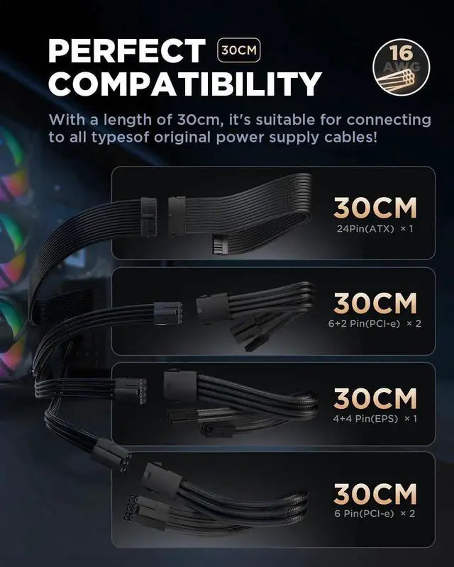 PSU Extension Cable Kit1x24 Pin ATX Extension Cable (for Motherboard), 1x (4+4) Pin EPS Cable (for CPU), 2 x 6+2-Pin PCI-e Cable and 2 x 6-Pin PCI-e Cable (for GPU), supplied two sets of cable combs, compatible with all power supply cables (must be connected to the power cable, not to the power supply)