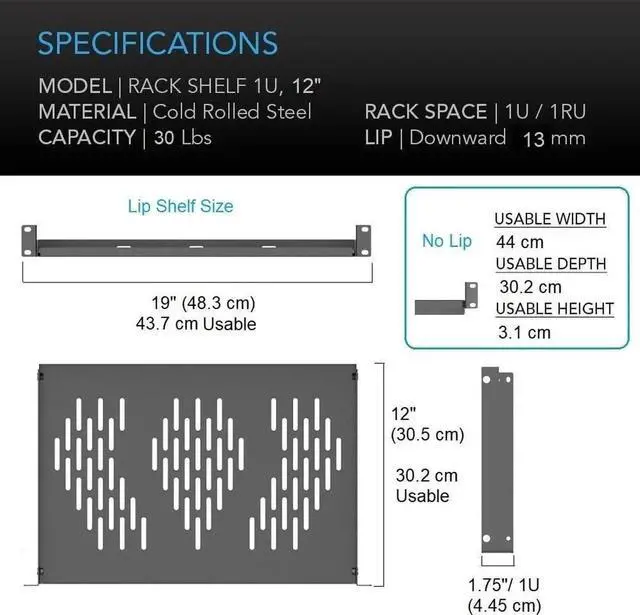 Good Ventilation: The 12" deep server rack shelf with many vented holes accelerates the heat dissipation speed and keeps the equipment cool and long-lasting.