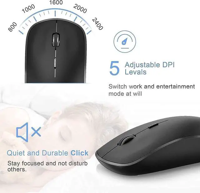 High Precision DPI 2400 in 5 levels: The cordless mouse allows for easy cursor sensitivity adjustment with up to 2400 DPI in 5 levels. Perfect for office use with 1600 DPI or up to 2400 DPI for 4K monitors or gaming. Adjustable polling rate of 125Hz and 250Hz by pressing the right key and wheel simultaneously.