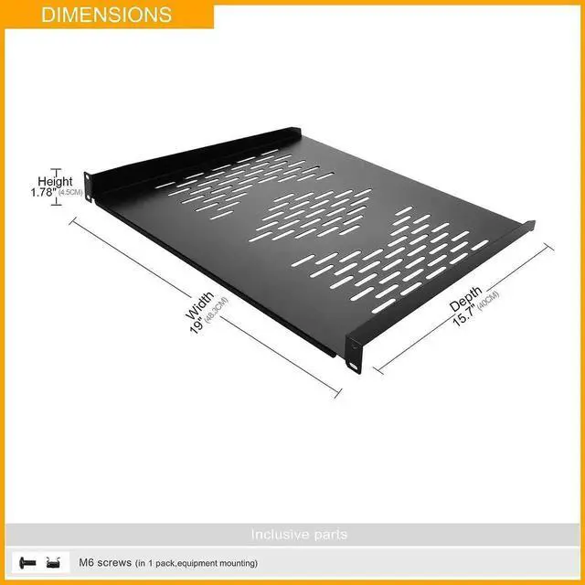 DIMENSION: 19 (width) * 15.7 (depth) * 1.78 (height). Comes with 2 pieces of 16 " depth server rack shelves, mounting screws & cage nuts in one packing box.