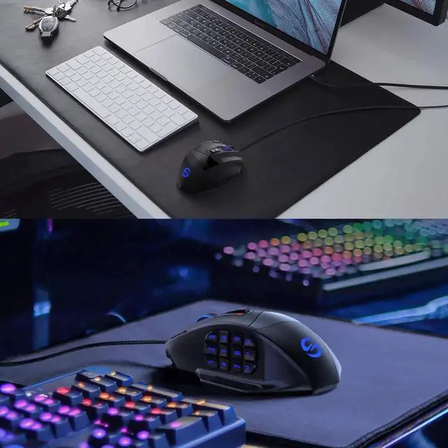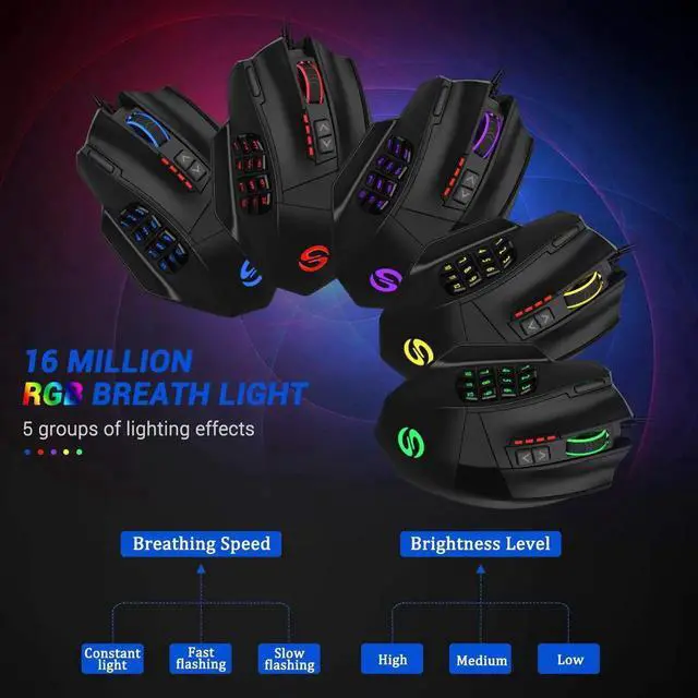 FULLY CUSTOMIZABLE MOUSE & RGB BACKLITVenus MMO wired gaming mouse with multiple programmable buttons (included 12 side buttons), 5 custom profiles each with 5 LED RGB colors backlit modes for quick identification of profiles and additional options for over 16 million LED RGB colors. The LED breathing light can be disabled according to your preference. Special Setting Switch Button on the bottom of the wired gaming mouse allows you to execute the switch profile command with maximum efficiency.