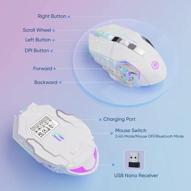 Stable Bluetooth/2.4G Wireless Connection The gaming mouse supports dual-mode connection, and meet your need on different devices. Bluetooth mode: support Windows 8/10, Mac OS, iPad, or iPhone Series (NOTE: NOTE: It is required to update your system to iPad OS 13/ iOS 13 or Above and Turn on the Assistive Touch on the iPad/ iPhone: Setting - Accessibility - Assistive Touch for an iPad usage.) 2.4G Wireless Mode: just plug the USB receiver to your PC, no additional driver or software is needed.
