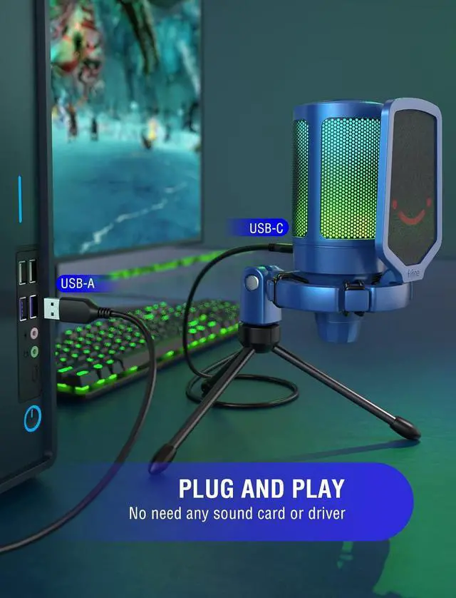 FIFINE Gaming Streaming USB PC Microphone for Mac OS/Windows, AmpliGame Condenser Cardioid Mic with RGB for Video Vocal Recording Twitch Discord, Gamer Computer Mic-Blue