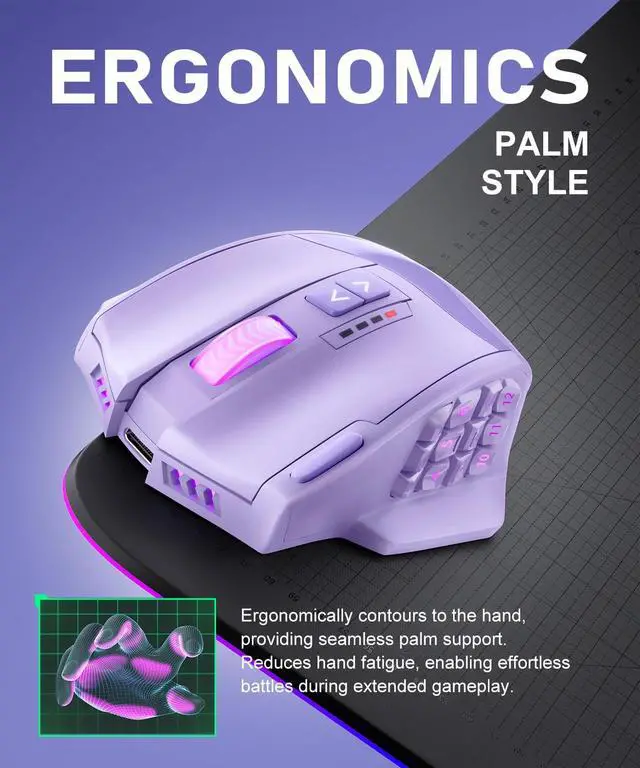 Ergonomic Design Ensures Your ComfortableGreat as a real mouse stuck in your hand. The UtechSmart Venus Pro Wireless RGB MMO gaming mouse is flawlessly designed to alleviate wrist fatigue while being able to firmly hold the mouse in your hand. The grinding coating on the mouse surface increases the friction between your hand and the mouse. Grinding coating also provides gamer a extra comfortable sweat-resistant and skin-friendly gaming mouse.