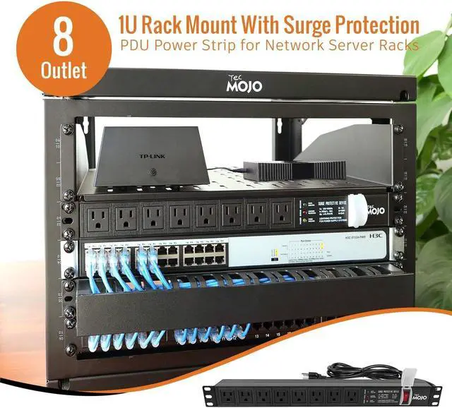 Tecmojo 1U Rack-Mount Horizontal 8-Outlet Power Strip UL Listed PDU with Surge Protection LED Indicators 6ft Cord Power Distribution for IT and Network Server Racks