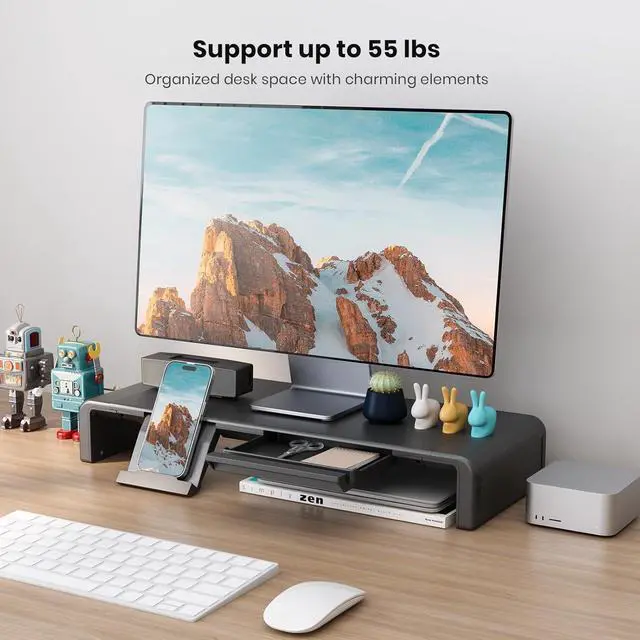 • Multi-functional Desk RiserThis monitor riser is equipped with hidden built-in tablet/phone holder and a storage drawer. All your necessary electronic devices and office essencials are prefectly organized for easy viewing and reaching.