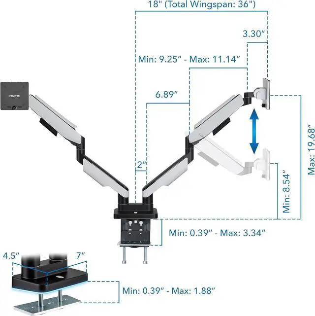 HEAVY-DUTY FULL MOTION DUAL ARM: The already built in heavy-duty tilting and gas spring mechanisms allow for smooth and stable adjustment of very large screens up to 35" / 44 lb including curved widescreen monitors. The full motion design including 18" arm extension, 180° swivel, 70° total tilt and a height range from 8.54" to 19.68" allows for the perfect viewing angle and height.