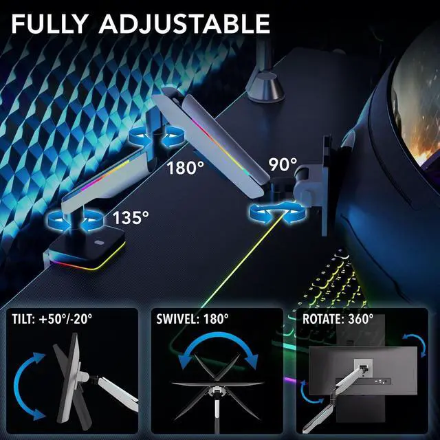 RGB LIGHTING EFFECTS: To create the perfect gaming set-up, we have integrated USB powered RGB lights into the arm and the base - the control button on the base of this monitor mount for ultrawide screens makes switching between 20 different colors and effects easy.