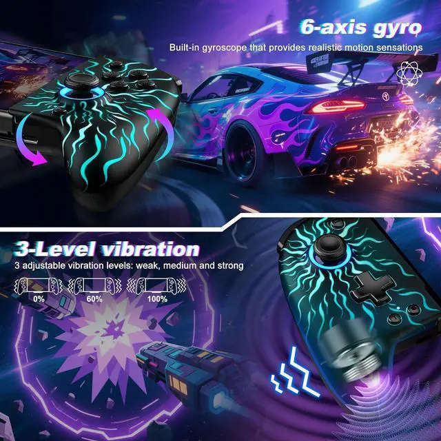 Adjustable Vibration & Motion Control: This Switch controller with 3 levels of adjustable vibration, which can provide vibration for compatible games and provide you with a more realistic gaming experience. Sensitive motion control, fast response without delay, 6-axis gyro for gravity sensing, suitable for switch motion sensing games, such as Zelda, Mario Kart 8 Deluxe, etc. Provides a compelling and immersive gaming experience