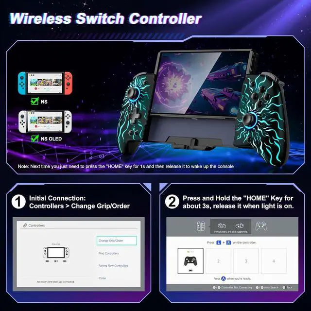 Wireless Switch Controller & Wake-up Function: Some customers have provided feedback that wired One-Piece Switch controllers cannot connect to the console. So we have launched this wireless Switch controller. When using this controller for the first time, Simply press and hold the "HOME" button for about 3 seconds and the red signal light flashes to complete the connection. To wake up the console, simply press the "HOME" button for about 0.5s. It is very easy to operate