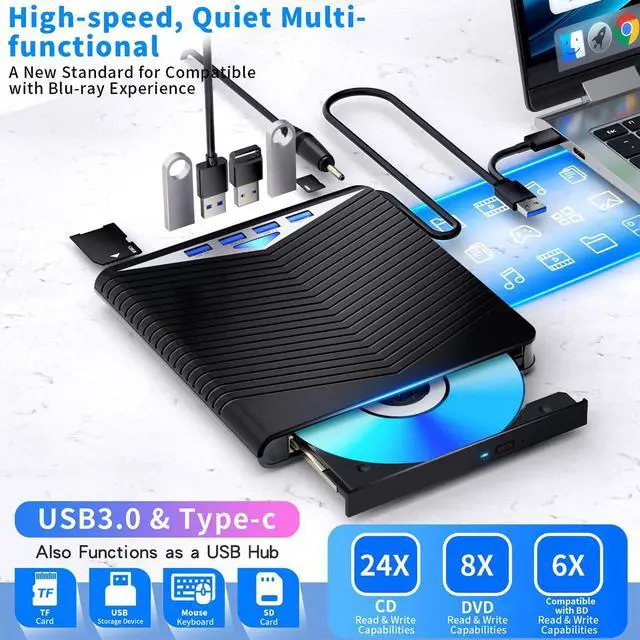 USB3.0 & USB-C (Type-C) & High-Speed Data Transfer Designcompatible with Blu-ray player is compatible with both USB3.0 and Type-C connections, achieving up to compatible with Blu-ray6x, 8x DVD, and 24x CD read/write speeds.