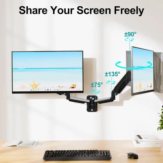 Most Advanced System - This monitor wall mounts for 2 monitors is built for thousands of movement by passing 10000-cycle tests, which achieves flexibility and stability than traditional mechanical spring. It can be adjusted to the weight of your monitor creating a suspended free-float effect. Please adjust it according to your monitor weight before use