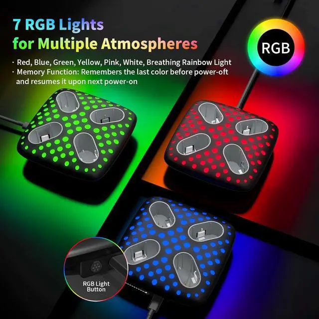 [Charging Station with RGB Night Lights]: There is 4 individual clear LED charging indicators for xbox series controller charge station, it changes colors between Red (Charging) and White (Ready), making it easy to tell which packs are good to go when you need to swap. You can also customize 7 modes of night light while charging. 6 single-color light modes and 1 breathing light mode. Long press RGB button for 3s to turn on/off, short press to switch color.