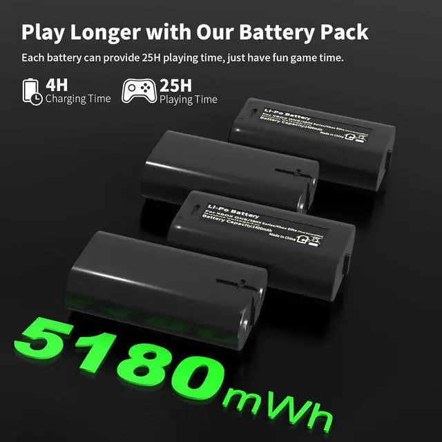 [Fast & Long Lasting Battery Pack]: Charger station for the Xbox one controller battery pack only takes 4 hours to charge fully 4 pack Xbox rechargeable batteries. Each Xbox controller battery pack provides up to 25 hours gaming time, you don't have to worry about being interrupted due to no power during the game.