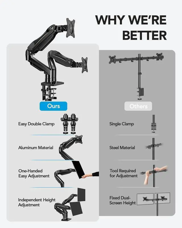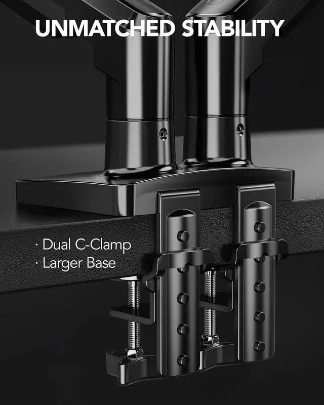 Dual C-Clamp Hold - Worried your dual monitors might wobble or slip? Our upgraded base uses a larger platform plus a dual C-clamp structure to lock the dual monitor arm firmly to your desk. Each arm safely keeps your screens steady while you type, click and gameno shaking, no sliding, just a clean and secure setup you can trust every day. It also provides Grommet Mounting installation choice, both options ensure stable and secure fixation for your 0.59" - 3.54" desk.