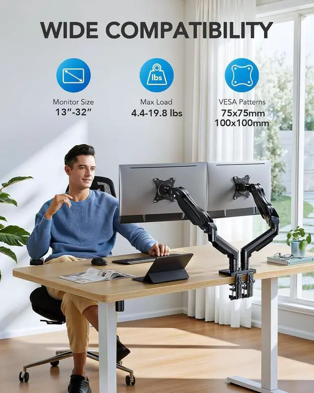 Compatible with Wide Screens - To ensure compatibility with the dual monitor mount, your each monitor must meet three conditions at the same time: First, computer screens size range: 13 to 32 inches. Second, screen weight range: 4.4 to 19.8 lbs. Third, the back of the monitor screen must have VESA mounting holes with a pitch of 75x75mm or 100x100mm.
