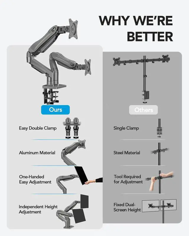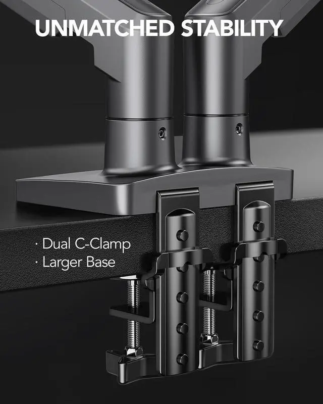 Dual C-Clamp Hold - Worried your dual monitors might wobble or slip? Our upgraded base uses a larger platform plus a dual C-clamp structure to lock the dual monitor arm firmly to your desk. Each arm safely keeps your screens steady while you type, click and gameno shaking, no sliding, just a clean and secure setup you can trust every day. It also provides Grommet Mounting installation choice, both options ensure stable and secure fixation for your 0.59" - 3.54" desk.