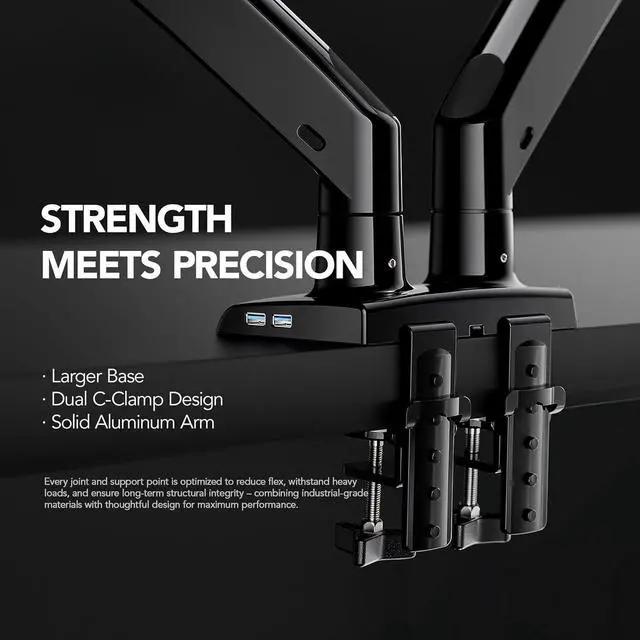 Improved Stability for Ultrawide Monitors: The upgraded dual monitor stand combines solid aluminum arms, a larger base, and a unique dual C-clamp design built to support heavier monitors. It securely holds two 13 40 screens weighing up to 26.4 lbs and supports VESA 75×75mm or 100×100mm.