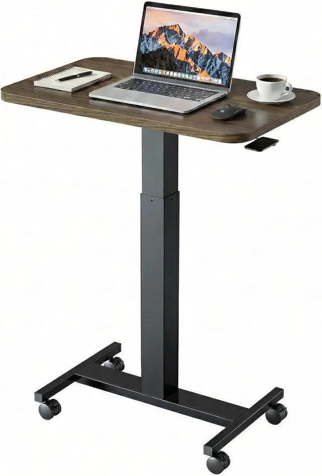 HUANUO Small Rolling Laptop Standing Desk, Height Adjustable Mobile T-Base Desk with Lockable Casters, Portable Sit-Stand Workstation for Bedside & Sofa, Walnut