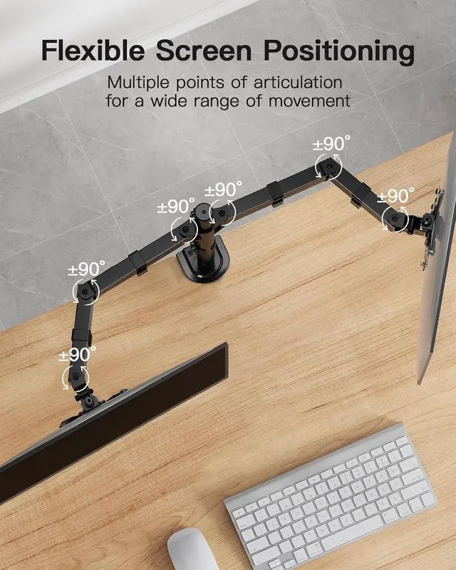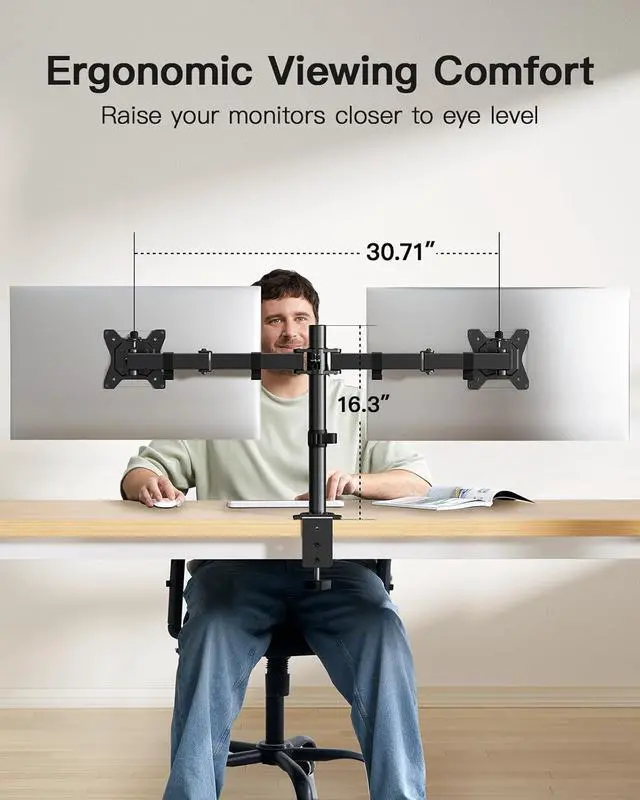 Flexible Adjustment: The dual monitor arm has a healthy range of adjustment that includes 16.73 inches of height adjustable, 45 degrees of tilt, 360 degrees of rotation, and 180 degrees of swivel. Various adjustment functions help placing your monitors to the position that fits you optimal. Work in ergonomic comfort.