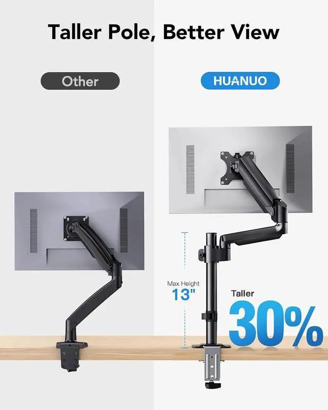 Taller Height Adjustment: Featuring a tall 13 column, this Huanuo dual monitor arm allows you to raise the center of your screens up to 20.87 above the desktop. This extra-column design greatly benefits individuals who prefer a higher viewing angle or have a taller stature, providing them with more height adjustment options to enjoy increased comfort with eye-level viewing.
