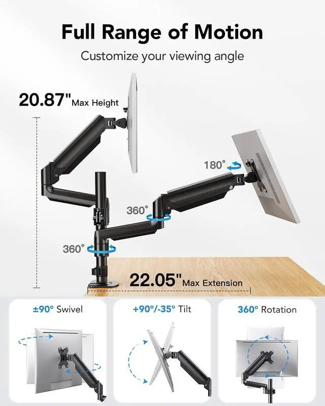 Customize Your Viewing Angle: The Huanuo dual monitor stand for desk features full motion flexibility with +90°/-35° screen tilt, 180° swivel range, and 360° monitor rotation for landscape or portrait mode. Also, after mounting the monitor, please use the Allen key to adjust the angle and tension of the tilt screw to ensure that the monitor mount is able to support the monitor stably.Easily configure an ergonomic viewing angle that can maximize comfort and productivity.