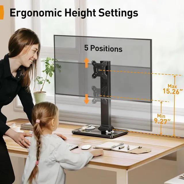 5 Ergonomic Height Settings The adjustable monitor stand features 5 height settings from 9.27 to 15.26 tall to fit your preferred viewing setup. The monitor riser is ergonomically designed to bring your display closer to eye level, helping to improve viewing posture and to minimize neck and eye fatigue.The best choice of monitor stands for offices, living rooms, and bedrooms.