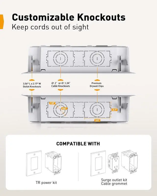 Choose Your Own Configuration: Featuring removable knockouts, our recessed outlet box offers multiple pre-set openings for a tailored setup. Easily choose the ideal position and size for cable routing or power outlet (not included) installation for a media connection that suits you. Plus, the included hook and loop strips help keep cables neatly bundled, preventing tangles and ensuring a well-organized, clutter-free media space.