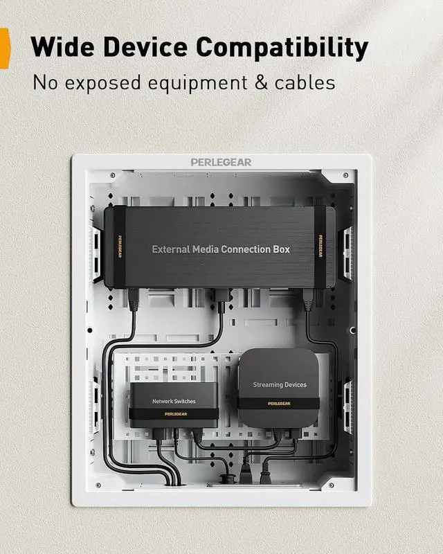 Plenty of Space: Our 17 media enclosure in wall offers nearly twice the space of standard 9 models, accommodating a wide range of devices. It's seamlessly compatible with Samsung One Connect Box, network switches, wireless routers, Apple TV and other streaming devices. Enjoy a versatile and clutter-free setup that keeps all your essential devices neatly organized behind your wall-mounted TV.