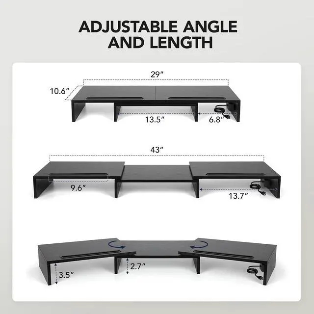HUANUO Dual Monitor Stand -Monitor Stand with USB ports ,Adjustable Length and Angle, Dual monitor riser w/ Desktop Socket, Monitor Stand Riser for PC, Computer, Laptop (Black)
